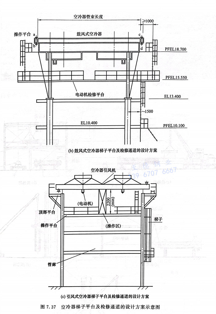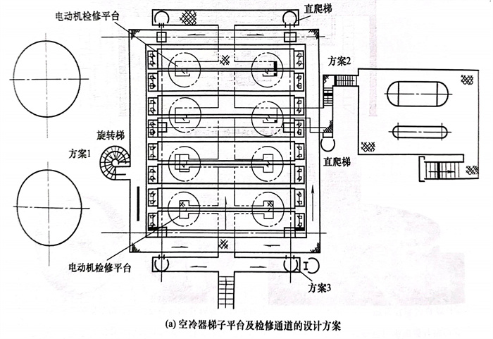 空(kong)冷(leng)器(qi)管(guan)(guan)束兩端管(guan)(guan)箱和傳動機(ji)械處應(ying)設置(zhi)平(ping)臺。布置(zhi)空(kong)冷(leng)器(qi)的(de)(de)(de)構架或主管(guan)(guan)廊的(de)(de)(de)一側地(di)面上應(ying)留有必(bi)要的(de)(de)(de)檢修場地(di)和通道(dao)。如(ru)圖(tu)7.37所示(shi),空(kong)冷(leng)器(qi)成排布置(zhi)在管(guan)(guan)廊頂部時,梯子平(ping)臺的(de)(de)(de)設置(zhi)可采用(yong)以(yi)下3種方案。