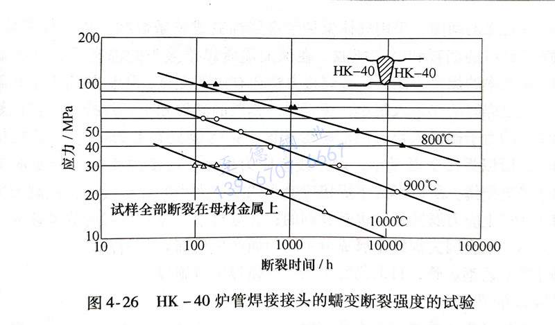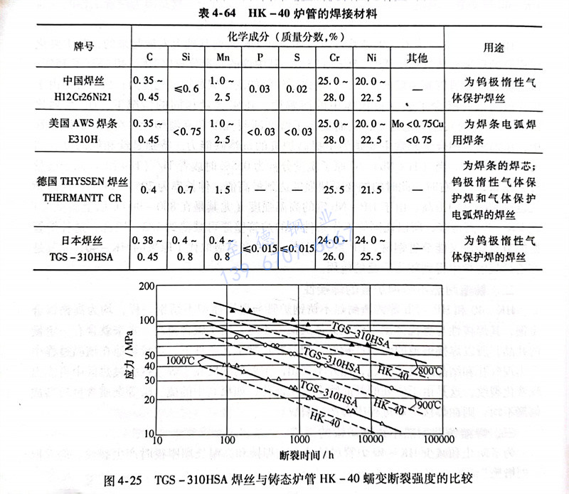 用于HK-40爐管(guan)焊(han)(han)接的(de)(de)焊(han)(han)接材(cai)料見表(biao)4-64。其中(zhong)TGS-310HSA 實芯(xin)焊(han)(han)絲(si)(si)具(ju)有(you)良(liang)好的(de)(de)焊(han)(han)接性,同時也基本(ben)具(ju)備了HK-40爐管(guan)在高(gao)(gao)溫長期服(fu)役過程所需要的(de)(de)蠕(ru)(ru)(ru)變斷(duan)裂(lie)(lie)強度(du)。該焊(han)(han)絲(si)(si)中(zhong)的(de)(de)鎳(nie)含量較高(gao)(gao)[w(Ni)≥24%],所焊(han)(han)成的(de)(de)焊(han)(han)縫(feng)金(jin)(jin)屬(shu)在650~900℃溫度(du)范圍內(nei)長期服(fu)役不(bu)會(hui)有(you)局部σ相析出。該焊(han)(han)絲(si)(si)所得的(de)(de)全(quan)焊(han)(han)縫(feng)金(jin)(jin)屬(shu)(熔敷金(jin)(jin)屬(shu))在高(gao)(gao)溫試(shi)驗(yan)的(de)(de)蠕(ru)(ru)(ru)變斷(duan)裂(lie)(lie)強度(du)與鑄態HK-40爐管(guan)的(de)(de)比較,如圖4-25所示(shi)。從(cong)圖中(zhong)可以看出,當斷(duan)裂(lie)(lie)時間相同時,熔敷金(jin)(jin)屬(shu)的(de)(de)蠕(ru)(ru)(ru)變斷(duan)裂(lie)(lie)強度(du)高(gao)(gao)于爐管(guan)。用這種焊(han)(han)絲(si)(si)焊(han)(han)成的(de)(de)焊(han)(han)接接頭(tou)進行了蠕(ru)(ru)(ru)變斷(duan)裂(lie)(lie)強度(du)試(shi)驗(yan),結果(guo)如圖4-26所示(shi),所有(you)的(de)(de)試(shi)樣均斷(duan)裂(lie)(lie)于基本(ben)金(jin)(jin)屬(shu)上。這類高(gao)(gao)合金(jin)(jin)材(cai)料焊(han)(han)絲(si)(si)的(de)(de)硫和磷(lin)含量很低(di),對(dui)提高(gao)(gao)焊(han)(han)縫(feng)金(jin)(jin)屬(shu)抗裂(lie)(lie)性是有(you)益的(de)(de)。