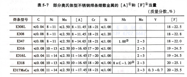 部分奧氏體不銹鋼焊條熔(rong)敷(fu)金屬(shu)的鐵素(su)體形(xing)成(cheng)元(yuan)素(su)和奧氏體形(xing)成(cheng)元(yuan)素(su)的當量見表5-7。