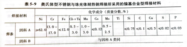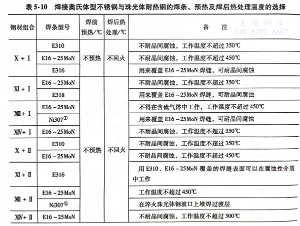 焊(han)接珠光(guang)體耐熱鋼(gang)+奧氏體型不銹鋼(gang)時,有關焊(han)條、焊(han)前預熱和焊(han)后熱處理的選(xuan)擇可參見(jian)表5-10。