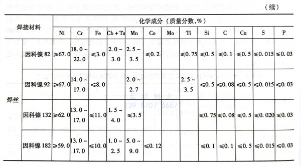對于重要的奧氏體不銹(xiu)鋼(gang)與(yu)珠(zhu)光體耐熱鋼(gang)焊(han)(han)(han)(han)(han)(han)接結構,已廣泛采(cai)用(yong)鎳(nie)基(ji)合金(jin)型焊(han)(han)(han)(han)(han)(han)接材(cai)料。常(chang)用(yong)的鎳(nie)基(ji)合金(jin)型焊(han)(han)(han)(han)(han)(han)接材(cai)料是“因(yin)(yin)科(ke)鎳(nie)”類焊(han)(han)(han)(han)(han)(han)條(tiao)和(he)焊(han)(han)(han)(han)(han)(han)絲(si),其化(hua)學(xue)成(cheng)(cheng)分見表5-9。焊(han)(han)(han)(han)(han)(han)條(tiao)具體牌號有“因(yin)(yin)科(ke)A”和(he)“因(yin)(yin)科(ke)B”兩種(zhong)。這兩種(zhong)焊(han)(han)(han)(han)(han)(han)條(tiao)的化(hua)學(xue)成(cheng)(cheng)分類似,“因(yin)(yin)科(ke)A”焊(han)(han)(han)(han)(han)(han)條(tiao)需用(yong)直流電(dian)(dian)源進行施焊(han)(han)(han)(han)(han)(han),而“因(yin)(yin)科(ke)B”采(cai)用(yong)交流電(dian)(dian)源施焊(han)(han)(han)(han)(han)(han)。因(yin)(yin)此,在(zai)電(dian)(dian)弧(hu)(hu)(hu)偏吹(chui)難以克服(fu)時,應盡量(liang)采(cai)用(yong)“因(yin)(yin)科(ke)B”。焊(han)(han)(han)(han)(han)(han)絲(si)牌號有“因(yin)(yin)科(ke)鎳(nie)”82等(deng),主要供鎢(wu)極氬弧(hu)(hu)(hu)焊(han)(han)(han)(han)(han)(han)、埋弧(hu)(hu)(hu)焊(han)(han)(han)(han)(han)(han)和(he)等(deng)離(li)子弧(hu)(hu)(hu)焊(han)(han)(han)(han)(han)(han)接時使用(yong)。