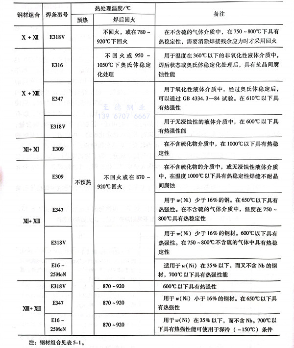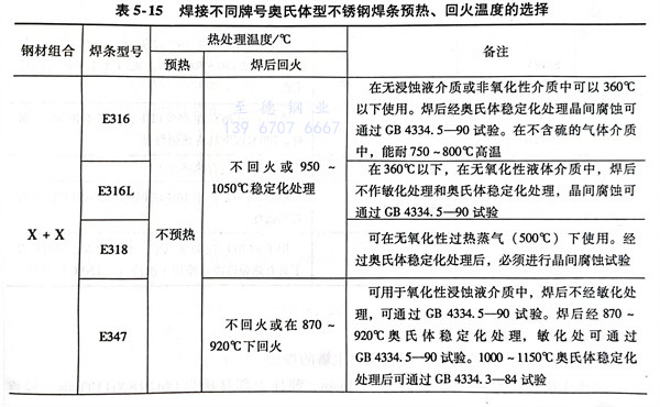 有關不同(tong)牌號(hao)的奧(ao)氏體型不銹鋼(gang)管焊(han)接時,焊(han)條、預熱和(he)回火(huo)溫度的選擇見表5-15。