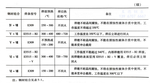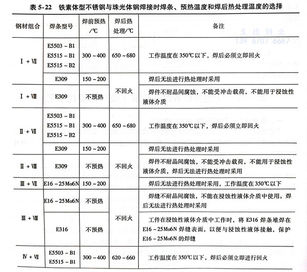 鐵素體型不銹鋼與珠光體鋼焊接可采用焊條電弧焊、CO2氣體保護焊和埋弧焊等方法。焊條電弧焊焊接時,選用的焊條、預熱溫度和焊后熱處理溫度見表5-22。