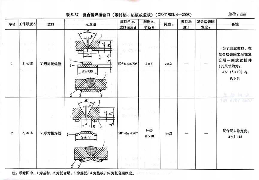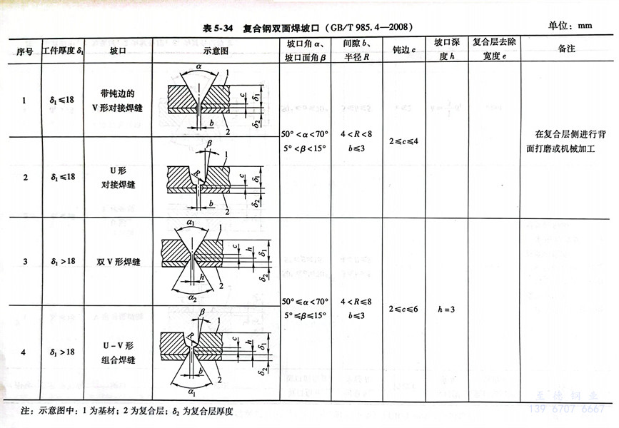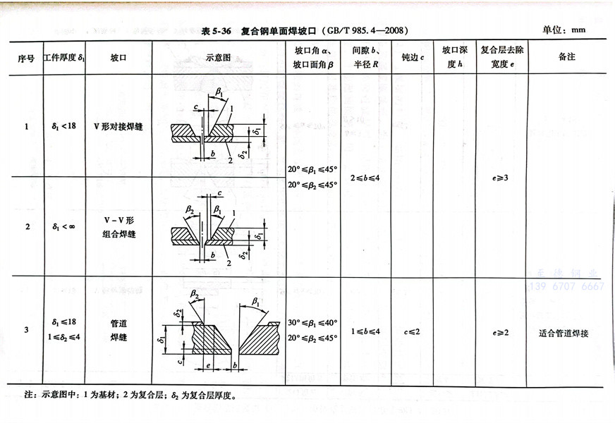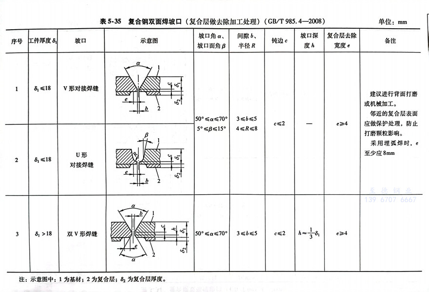 全國(guo)壓力容器標準化技術委(wei)員會(hui)推(tui)薦(jian)《GB/T 985.2-2008復合鋼的推(tui)薦(jian)坡口》在(zai)壓力容器及受壓元件(jian)使用,見表5-34~表5-37。