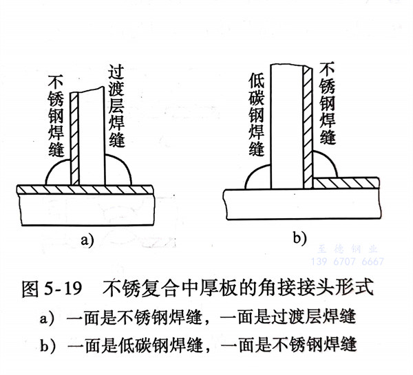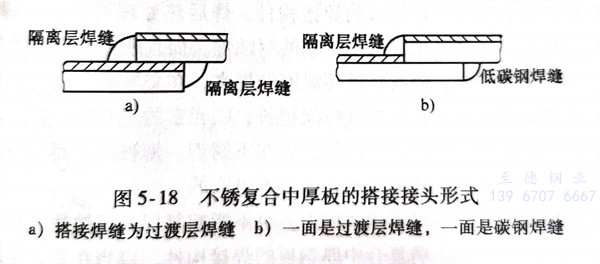 不(bu)銹(xiu)(xiu)鋼(gang)復合中(zhong)(zhong)厚鋼(gang)板的(de)搭接接頭和角接接頭形式(shi)如圖(tu)5-18和圖(tu)5-19所(suo)示。在待(dai)焊區中(zhong)(zhong)碳(tan)鋼(gang)和不(bu)銹(xiu)(xiu)鋼(gang)的(de)共存部位(wei),要選(xuan)用過渡層(ceng)(ceng)的(de)焊接材(cai)(cai)(cai)料(liao)。待(dai)焊處都是(shi)(shi)碳(tan)鋼(gang)時(shi),可以按基層(ceng)(ceng)所(suo)選(xuan)用的(de)焊接材(cai)(cai)(cai)料(liao)進行施焊;同樣,待(dai)焊區都是(shi)(shi)不(bu)銹(xiu)(xiu)鋼(gang)材(cai)(cai)(cai)料(liao)時(shi),理應選(xuan)用復層(ceng)(ceng)的(de)焊接材(cai)(cai)(cai)料(liao),但考慮到焊接熔(rong)池的(de)深度,可能將(jiang)基層(ceng)(ceng)熔(rong)化,此時(shi)第一(yi)層(ceng)(ceng)焊縫仍要選(xuan)用過渡層(ceng)(ceng)的(de)焊接材(cai)(cai)(cai)料(liao),切不(bu)可忽視。