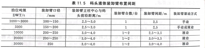 ②. 液體裝卸臂(bei)(bei)在碼頭(tou)上應合理布(bu)置,液體裝卸臂(bei)(bei)立柱中心線至(zhi)碼頭(tou)前沿(yan)的(de)距(ju)離及液體裝卸臂(bei)(bei)間距(ju)可按表11.5選用。