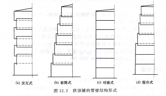 罐壁(bi)是主要受(shou)力部件,壁(bi)板的各(ge)縱(zong)焊(han)縫(feng)采用(yong)對接焊(han),環焊(han)縫(feng)采用(yong)套筒式或對接式,也有采用(yong)混(hun)合式連接,如圖12.2所示。拱(gong)頂(ding)罐的罐頂(ding)近似于球(qiu)面,按截面形(xing)狀有準(zhun)球(qiu)形(xing)拱(gong)頂(ding)和球(qiu)形(xing)拱(gong)頂兩種,見(jian)圖12.3。拱(gong)頂油(you)罐(guan)由于氣相空(kong)間(jian)大(da),油(you)品蒸發損耗大(da),故(gu)不(bu)宜儲存輕(qing)質(zhi)油(you)品和原(yuan)油(you),宜儲存低(di)揮發性及重質(zhi)油(you)品。