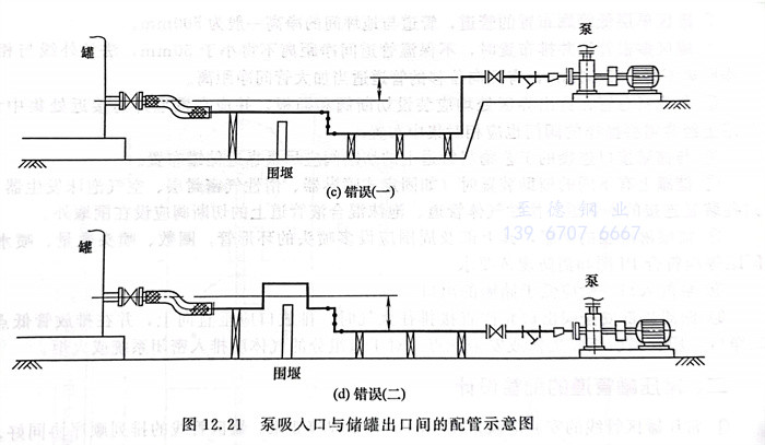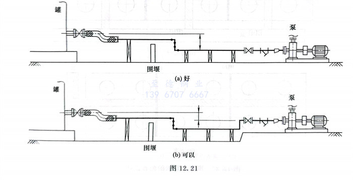 ⑦. 泵吸入口與儲罐(guan)出口間的配管(guan)(guan)應(ying)盡量縮(suo)短,不得有上袋形,盡量沒有下袋形,若無法避免下袋形時,泵入口配管(guan)(guan)中(zhong)心線不得高于(yu)儲罐(guan)管(guan)(guan)口中(zhong)心標(biao)高,見圖12.21。