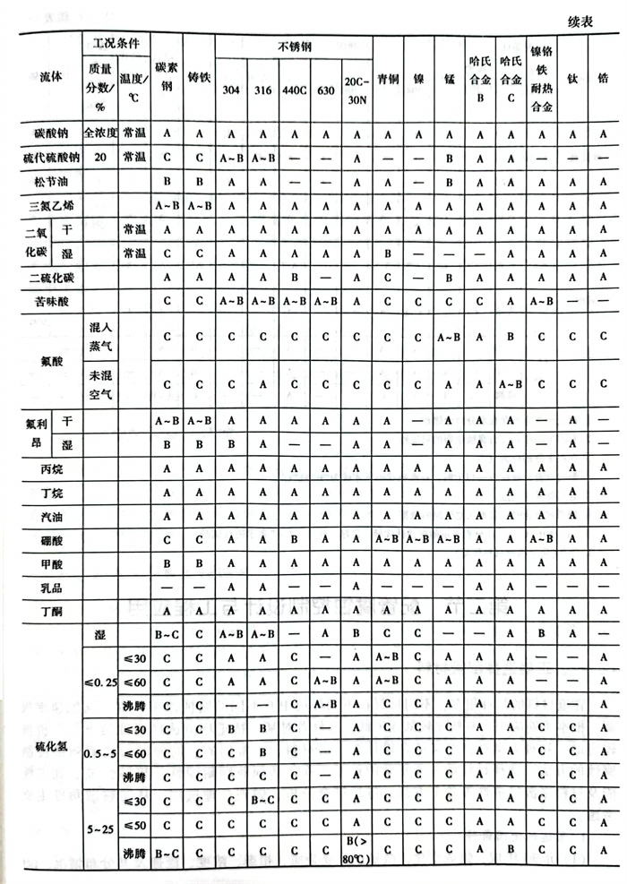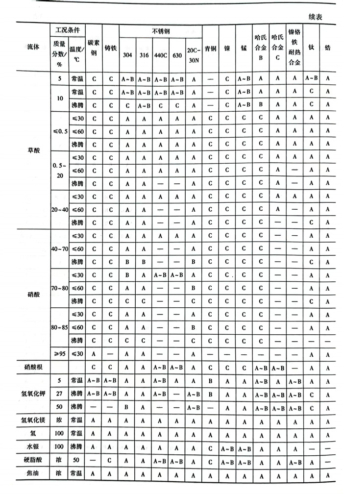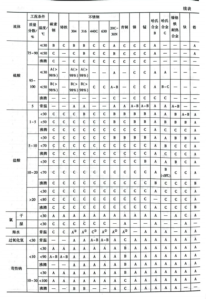 碳(tan)鋼(gang)(gang)(gang)(gang)廣泛應用于80℃以下、30%濃(nong)度內的氫(qing)氧(yang)化鈉溶液,也(ye)有許多(duo)工廠(chang)在100℃、75%以下時仍采用普(pu)通碳(tan)鋼(gang)(gang)(gang)(gang),雖然(ran)腐蝕增加,但是綜(zong)合經(jing)濟性(xing)好。普(pu)通不(bu)銹(xiu)鋼(gang)(gang)(gang)(gang)對(dui)堿液的耐蝕性(xing)與鑄鐵碳(tan)鋼(gang)(gang)(gang)(gang)相比沒(mei)有明顯優點。對(dui)于高溫堿液多(duo)采用鈦(tai)及鈦(tai)合金或者高合金不(bu)銹(xiu)鋼(gang)(gang)(gang)(gang)。