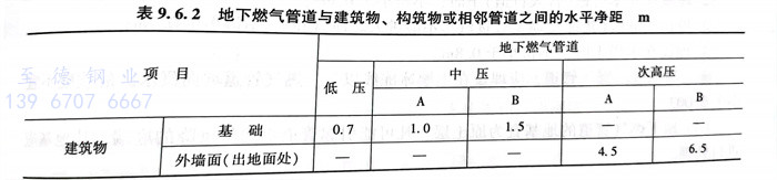 2. 地(di)下燃(ran)氣(qi)管(guan)道(dao)不(bu)應從建筑(zhu)物和(he)(he)大型構筑(zhu)物的(de)下面穿越。地(di)下燃(ran)氣(qi)管(guan)道(dao)與建筑(zhu)物、構筑(zhu)物或相(xiang)鄰管(guan)道(dao)之(zhi)間的(de)水(shui)平和(he)(he)垂(chui)直凈距(ju),不(bu)應小(xiao)于表(biao)9.6.2和(he)(he)表(biao)9.6.3的(de)規(gui)定。