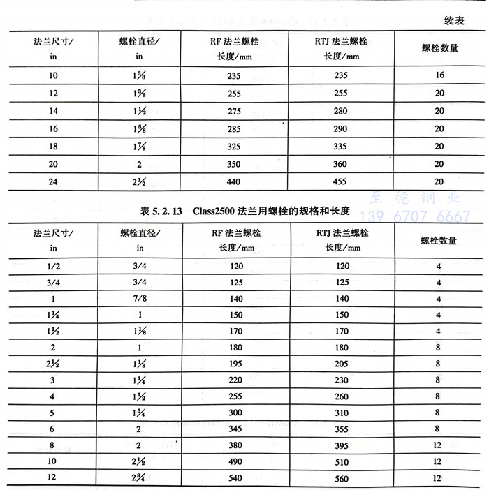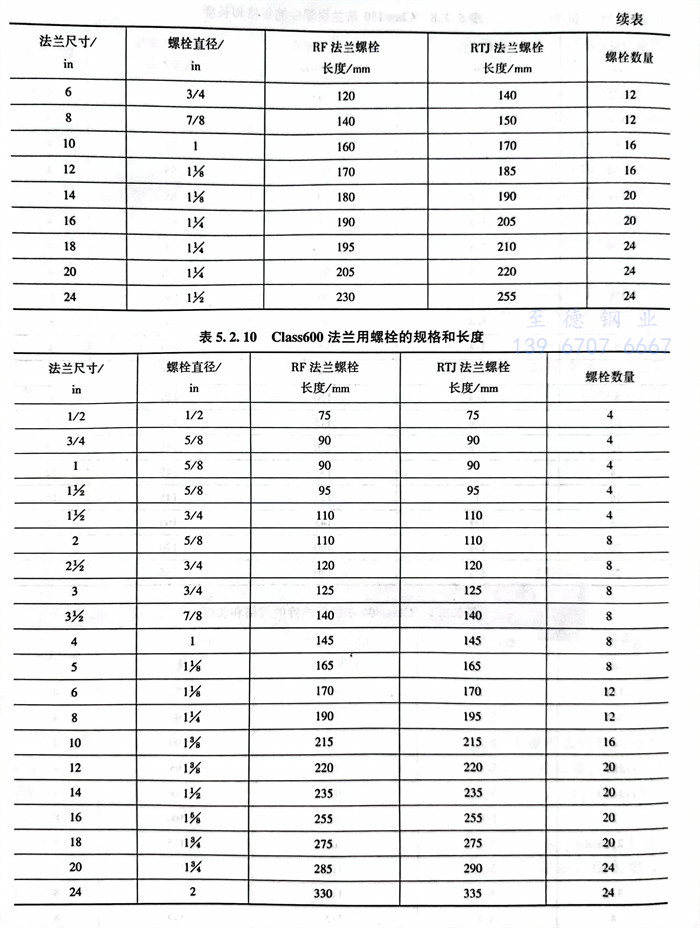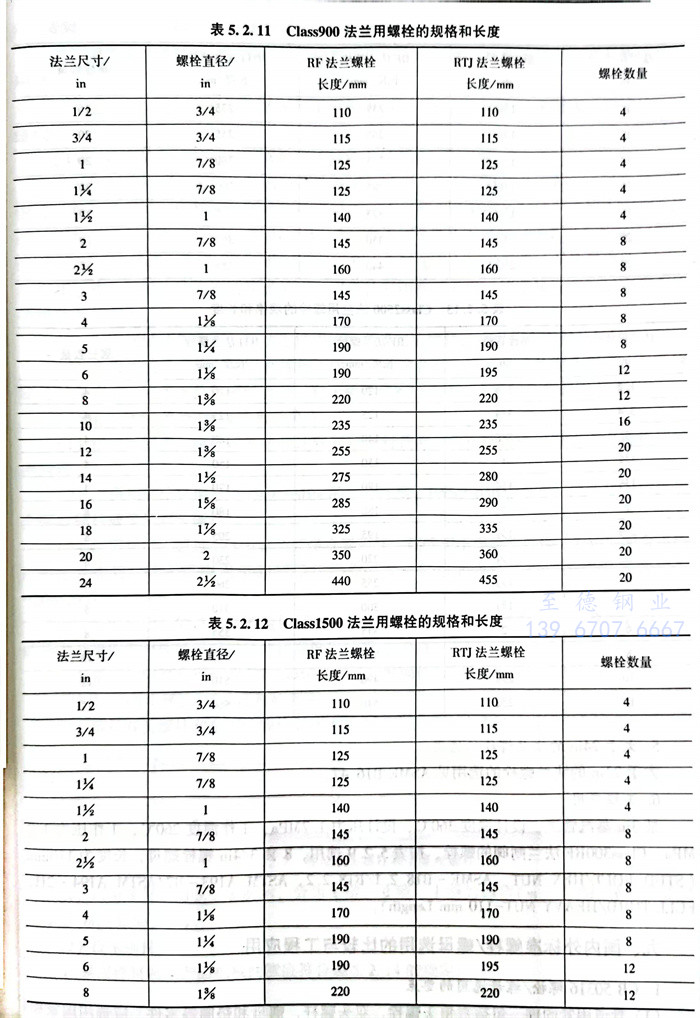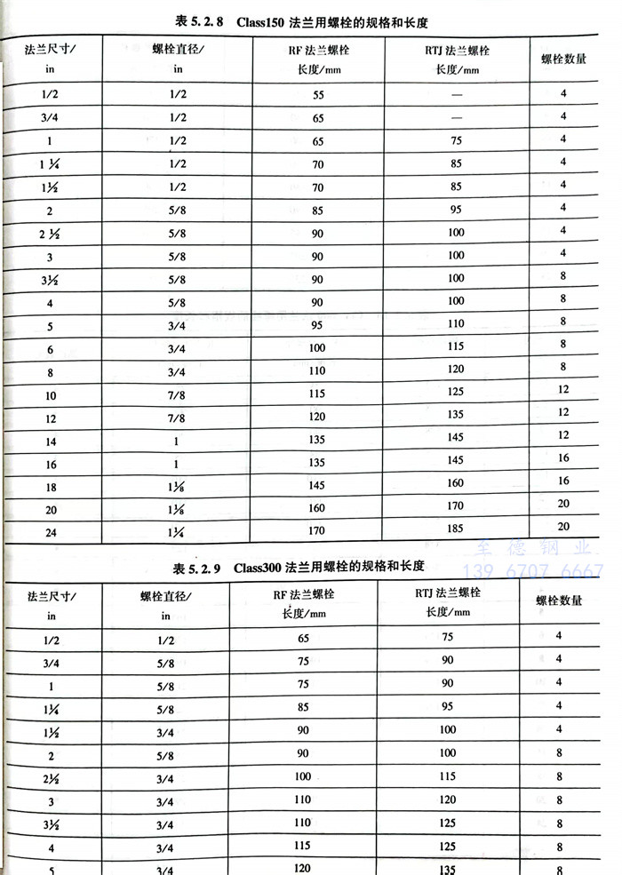 螺栓(shuan)長(chang)(chang)度的(de)取(qu)值可從(cong)ASMEB16.5中的(de)推薦值來選擇,但(dan)是,還需要考慮螺栓(shuan)自(zi)身的(de)牙型、施工安裝位置、連(lian)接(jie)件長(chang)(chang)度等(deng)因(yin)素。RF、RTJ法蘭用(yong)螺栓(shuan)的(de)規(gui)格和長(chang)(chang)度,Class150見(jian)(jian)表(biao)5.2.8,Class300見(jian)(jian)表(biao)5.2.9,Class600 見(jian)(jian)表(biao)5.2.10,Class900見(jian)(jian)表(biao)5.2.11,Class1500見(jian)(jian)表(biao)5.2.12,Class2500見(jian)(jian)表(biao)5.2.13。
