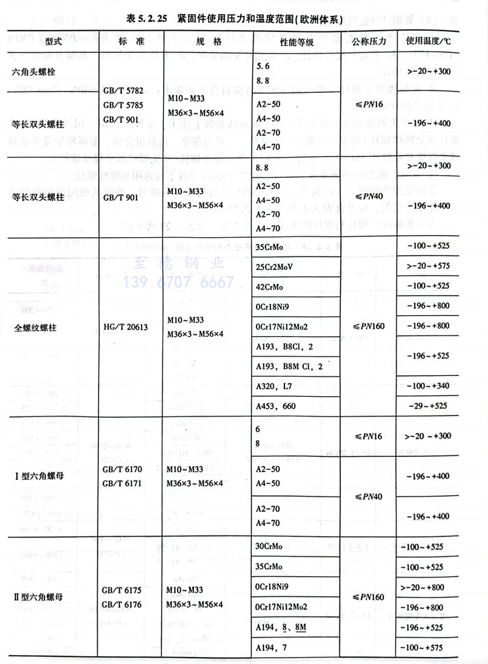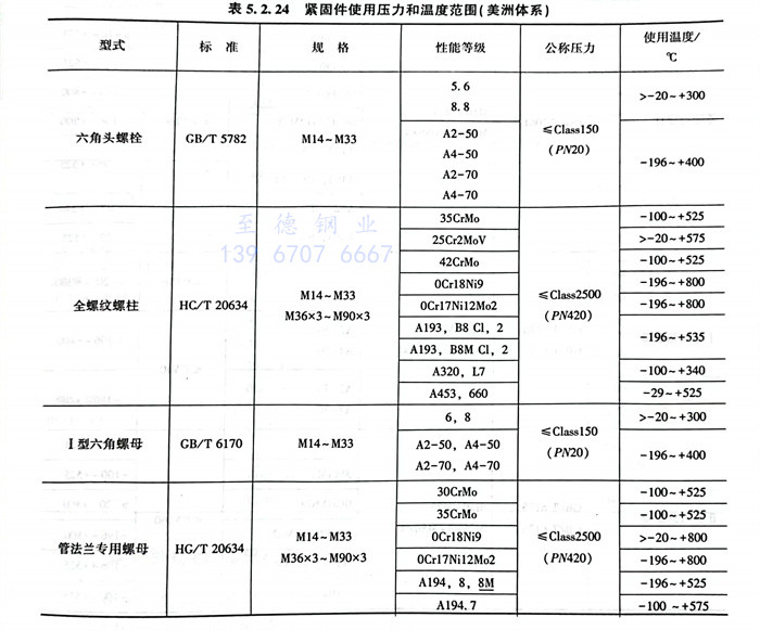 ⑤. 按緊固件的型式、產品等級、采用的性能等級和材料牌號,確定其使用的公稱壓力和工作溫度范圍,應符合表5.2.24、表5.2.25的規定。