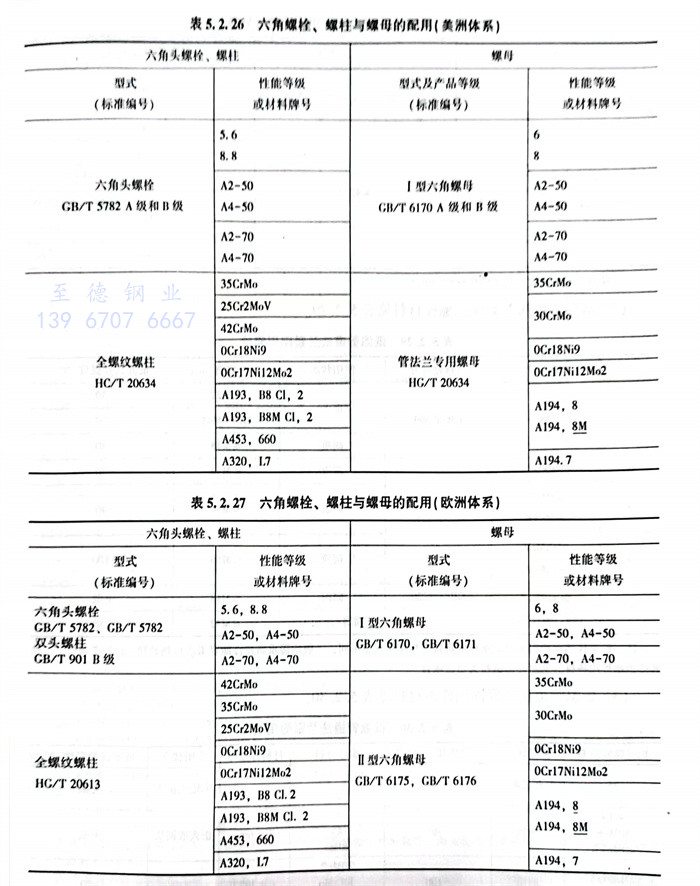 ⑥. 六角螺栓、螺柱與螺母的配用如表5.2.26、表5.2.27所示。