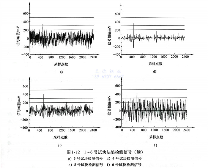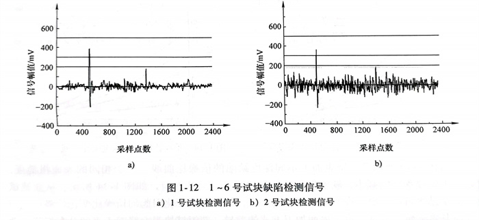 保持(chi)試(shi)驗條件不變(bian),探頭以相同(tong)速度掃查(cha)所有試(shi)塊(kuai),對不同(tong)深度的(de)裂紋(wen)進行漏磁檢測。各試(shi)塊(kuai)得到的(de)缺陷檢測信號如圖1-12所示。