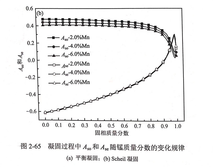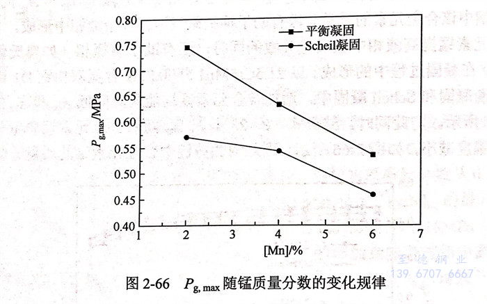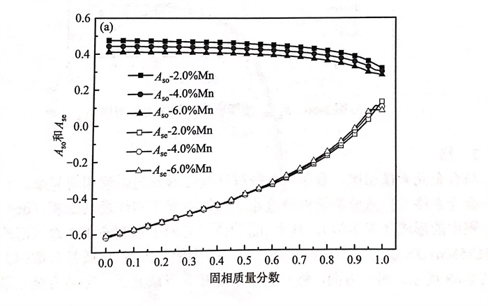 研究發現(xian)[19,25,95],部分合(he)金(jin)(jin)元(yuan)(yuan)(yuan)素(su)(su)(su)(su)(如(ru)(ru)錳和(he)(he)鉻)能(neng)夠提高液(ye)相(xiang)(xiang)中(zhong)(zhong)氮(dan)(dan)的(de)(de)(de)溶解度,減(jian)(jian)小Aso值;其中(zhong)(zhong)錳等合(he)金(jin)(jin)元(yuan)(yuan)(yuan)素(su)(su)(su)(su)在凝固(gu)過程中(zhong)(zhong)還能(neng)促(cu)進富(fu)氮(dan)(dan)相(xiang)(xiang)的(de)(de)(de)形(xing)成,減(jian)(jian)小枝晶(jing)間(jian)液(ye)相(xiang)(xiang)中(zhong)(zhong)氮(dan)(dan)的(de)(de)(de)富(fu)集,緩解氮(dan)(dan)偏(pian)析,降(jiang)低(di)(di)Ase值。如(ru)(ru)果(guo)合(he)金(jin)(jin)元(yuan)(yuan)(yuan)素(su)(su)(su)(su)能(neng)夠減(jian)(jian)小Aso與Ase的(de)(de)(de)總和(he)(he),那么提高鋼中(zhong)(zhong)該合(he)金(jin)(jin)元(yuan)(yuan)(yuan)素(su)(su)(su)(su)的(de)(de)(de)質(zhi)量(liang)分數(shu)(shu)(shu)有助于(yu)抑制氮(dan)(dan)氣泡(pao)在殘余液(ye)相(xiang)(xiang)中(zhong)(zhong)形(xing)成。合(he)金(jin)(jin)元(yuan)(yuan)(yuan)素(su)(su)(su)(su)錳提高液(ye)相(xiang)(xiang)中(zhong)(zhong)氮(dan)(dan)質(zhi)量(liang)分數(shu)(shu)(shu)的(de)(de)(de)同(tong)時,還有助于(yu)富(fu)氮(dan)(dan)相(xiang)(xiang)(如(ru)(ru)奧氏體相(xiang)(xiang)γ和(he)(he)hcp相(xiang)(xiang))在凝固(gu)過程中(zhong)(zhong)的(de)(de)(de)形(xing)成。以21.5Cr5Mn1.5Ni0.25N含氮(dan)(dan)雙(shuang)相(xiang)(xiang)鋼D1鑄錠為例,在平衡凝固(gu)和(he)(he)Scheil凝固(gu)中(zhong)(zhong),增(zeng)加(jia)合(he)金(jin)(jin)元(yuan)(yuan)(yuan)素(su)(su)(su)(su)錳均能(neng)同(tong)時降(jiang)低(di)(di)Aso和(he)(he)Ase的(de)(de)(de)值,如(ru)(ru)圖2-65所(suo)示。與此同(tong)時,結合(he)式(2-123),隨(sui)著合(he)金(jin)(jin)元(yuan)(yuan)(yuan)素(su)(su)(su)(su)錳質(zhi)量(liang)分數(shu)(shu)(shu)增(zeng)加(jia)而大幅度減(jian)(jian)小,如(ru)(ru)圖2-66所(suo)示。因此增(zeng)加(jia)鑄錠中(zhong)(zhong)合(he)金(jin)(jin)元(yuan)(yuan)(yuan)素(su)(su)(su)(su)錳的(de)(de)(de)質(zhi)量(liang)分數(shu)(shu)(shu)有助于(yu)抑制液(ye)相(xiang)(xiang)中(zhong)(zhong)氮(dan)(dan)氣泡(pao)的(de)(de)(de)形(xing)成,減(jian)(jian)少(shao)或消(xiao)除21.5Cr5Mn1.5Ni0.25N 含氮(dan)(dan)雙(shuang)相(xiang)(xiang)鋼中(zhong)(zhong)氮(dan)(dan)氣孔缺陷(xian),該結論(lun)與Young等報(bao)道的(de)(de)(de)一致。