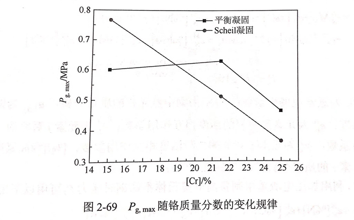 與(yu)合(he)(he)金(jin)(jin)元素(su)(su)(su)錳相比(bi),合(he)(he)金(jin)(jin)元素(su)(su)(su)鉻(ge)(ge)(ge)(ge)對氮(dan)氣(qi)孔形(xing)(xing)成(cheng)(cheng)的(de)(de)(de)(de)(de)(de)(de)(de)影響相對復雜。一(yi)(yi)(yi)方(fang)面,增(zeng)(zeng)加合(he)(he)金(jin)(jin)元素(su)(su)(su)鉻(ge)(ge)(ge)(ge)的(de)(de)(de)(de)(de)(de)(de)(de)質(zhi)量(liang)(liang)(liang)分(fen)(fen)數能(neng)提(ti)高液相中(zhong)氮(dan)的(de)(de)(de)(de)(de)(de)(de)(de)溶解度(du)和(he)促(cu)進(jin)富氮(dan)相(hcp 相)在(zai)(zai)凝固過程(cheng)中(zhong)的(de)(de)(de)(de)(de)(de)(de)(de)形(xing)(xing)成(cheng)(cheng)(圖(tu)2-67),減(jian)小Aso的(de)(de)(de)(de)(de)(de)(de)(de)值,有(you)助于(yu)(yu)抑制液相中(zhong)氮(dan)氣(qi)泡(pao)的(de)(de)(de)(de)(de)(de)(de)(de)形(xing)(xing)成(cheng)(cheng)。以21.5Cr5Mn1.5Ni0.25N 含氮(dan)雙相鋼D1鑄錠(ding)為(wei)例,Aso隨(sui)鉻(ge)(ge)(ge)(ge)質(zhi)量(liang)(liang)(liang)分(fen)(fen)數的(de)(de)(de)(de)(de)(de)(de)(de)變化(hua)規律,如圖(tu)2-68所示(shi)(shi)。另一(yi)(yi)(yi)方(fang)面,鉻(ge)(ge)(ge)(ge)作為(wei)鐵素(su)(su)(su)體相8形(xing)(xing)成(cheng)(cheng)元素(su)(su)(su),提(ti)高合(he)(he)金(jin)(jin)元素(su)(su)(su)鉻(ge)(ge)(ge)(ge)的(de)(de)(de)(de)(de)(de)(de)(de)質(zhi)量(liang)(liang)(liang)分(fen)(fen)數有(you)利于(yu)(yu)貧氮(dan)鐵素(su)(su)(su)體相8的(de)(de)(de)(de)(de)(de)(de)(de)形(xing)(xing)成(cheng)(cheng)(圖(tu)2-67),從而(er)加劇(ju)液相中(zhong)氮(dan)的(de)(de)(de)(de)(de)(de)(de)(de)富集(ji),增(zeng)(zeng)大氮(dan)的(de)(de)(de)(de)(de)(de)(de)(de)偏析,增(zeng)(zeng)加Ase(如圖(tu)2-68所示(shi)(shi)),對液相中(zhong)氮(dan)氣(qi)泡(pao)的(de)(de)(de)(de)(de)(de)(de)(de)形(xing)(xing)成(cheng)(cheng)具有(you)促(cu)進(jin)作用。這種矛盾在(zai)(zai)平衡(heng)凝固過程(cheng)中(zhong)較為(wei)突(tu)出,當合(he)(he)金(jin)(jin)元素(su)(su)(su)鉻(ge)(ge)(ge)(ge)的(de)(de)(de)(de)(de)(de)(de)(de)質(zhi)量(liang)(liang)(liang)分(fen)(fen)數從15%增(zeng)(zeng)至21.5%時,由(you)于(yu)(yu)Ase的(de)(de)(de)(de)(de)(de)(de)(de)增(zeng)(zeng)量(liang)(liang)(liang)大于(yu)(yu)Aso的(de)(de)(de)(de)(de)(de)(de)(de)減(jian)小量(liang)(liang)(liang),Pg,max呈現增(zeng)(zeng)大的(de)(de)(de)(de)(de)(de)(de)(de)趨(qu)勢(shi),如圖(tu)2-69所示(shi)(shi);當合(he)(he)金(jin)(jin)元素(su)(su)(su)鉻(ge)(ge)(ge)(ge)的(de)(de)(de)(de)(de)(de)(de)(de)質(zhi)量(liang)(liang)(liang)分(fen)(fen)數進(jin)一(yi)(yi)(yi)步增(zeng)(zeng)加至25%時,Ase和(he)Aso分(fen)(fen)別增(zeng)(zeng)大和(he)減(jian)小,但(dan)與(yu)Ase相比(bi)Aso的(de)(de)(de)(de)(de)(de)(de)(de)變化(hua)量(liang)(liang)(liang)十分(fen)(fen)明顯,進(jin)而(er)導致Pg出現減(jian)小的(de)(de)(de)(de)(de)(de)(de)(de)趨(qu)勢(shi)。然而(er),在(zai)(zai)Scheil凝固中(zhong),隨(sui)著(zhu)合(he)(he)金(jin)(jin)元素(su)(su)(su)鉻(ge)(ge)(ge)(ge)質(zhi)量(liang)(liang)(liang)分(fen)(fen)數的(de)(de)(de)(de)(de)(de)(de)(de)提(ti)高,有(you)助于(yu)(yu)Aso大幅度(du)降低(di),Pg,max始(shi)終保持單調(diao)遞減(jian)的(de)(de)(de)(de)(de)(de)(de)(de)趨(qu)勢(shi),如圖(tu)2-69所示(shi)(shi)。總之,隨(sui)著(zhu)合(he)(he)金(jin)(jin)元素(su)(su)(su)鉻(ge)(ge)(ge)(ge)質(zhi)量(liang)(liang)(liang)分(fen)(fen)數的(de)(de)(de)(de)(de)(de)(de)(de)增(zeng)(zeng)加,Aso與(yu)Ase之和(he)的(de)(de)(de)(de)(de)(de)(de)(de)變化(hua)非單調(diao),合(he)(he)金(jin)(jin)元素(su)(su)(su)鉻(ge)(ge)(ge)(ge)對液相中(zhong)氮(dan)氣(qi)泡(pao)形(xing)(xing)成(cheng)(cheng)的(de)(de)(de)(de)(de)(de)(de)(de)影響呈現出雙面性,同樣(yang)對鑄錠(ding)內氣(qi)孔的(de)(de)(de)(de)(de)(de)(de)(de)形(xing)(xing)成(cheng)(cheng)也具有(you)雙面性。