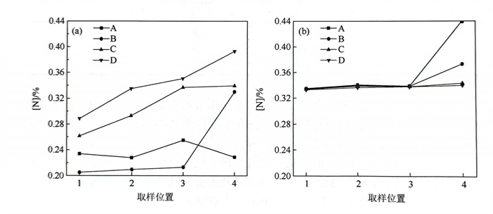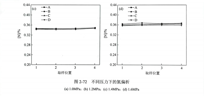王書桓等(deng)研究了(le)1.0MPa、1.2MPa、1.4MPa和(he)1.6MPa壓(ya)力(li)下(xia)的(de)(de)(de)氮(dan)偏(pian)析(xi)(圖(tu)2-72).對比不(bu)同壓(ya)力(li)下(xia)的(de)(de)(de)結果(guo),可以(yi)發現(xian)1MPa下(xia)鑄錠內部氮(dan)偏(pian)析(xi)嚴重,隨(sui)著壓(ya)力(li)的(de)(de)(de)提高(gao),氮(dan)宏觀偏(pian)析(xi)得到(dao)(dao)了(le)很(hen)大(da)改(gai)善。當壓(ya)力(li)提高(gao)到(dao)(dao)1.6MPa時,氮(dan)的(de)(de)(de)偏(pian)析(xi)程度(du)明(ming)顯小于1.0MPa和(he)1.2MPa下(xia)凝固(gu)的(de)(de)(de)鑄錠,各部位氮(dan)含(han)量在0.360%左右,表(biao)明(ming)增大(da)壓(ya)力(li)提高(gao)了(le)氮(dan)的(de)(de)(de)飽和(he)溶(rong)解度(du)。因此,在凝固(gu)過(guo)程中(zhong)提高(gao)氮(dan)氣(qi)壓(ya)力(li)可以(yi)對氮(dan)的(de)(de)(de)析(xi)出(chu)起到(dao)(dao)抑制作(zuo)用,對氮(dan)由固(gu)相到(dao)(dao)液(ye)相的(de)(de)(de)傳質起到(dao)(dao)阻(zu)礙作(zuo)用,使整個鑄錠中(zhong)氮(dan)的(de)(de)(de)分壓(ya)趨于均勻,從而(er)減(jian)輕氮(dan)的(de)(de)(de)宏觀偏(pian)析(xi)。