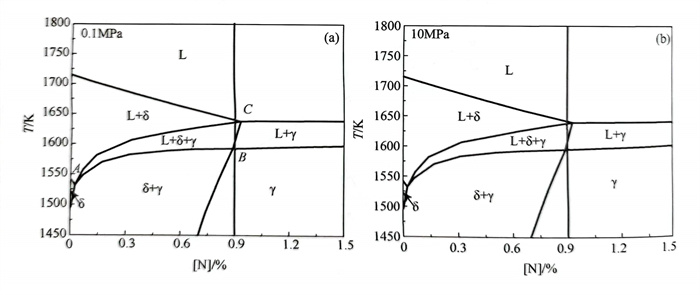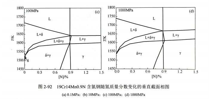 19Cr14Mn0.9N含氮(dan)鋼(gang)凝固過程中鐵素(su)體(ti)相(xiang)8和奧氏體(ti)相(xiang)γ的單相(xiang)區(qu)隨壓(ya)力的變化(hua)規律如(ru)圖2-95所(suo)示(shi)。當(dang)壓(ya)力從(cong)0.1MPa增加到100MPa時,δ/(δ+L)相(xiang)邊(bian)(bian)界變化(hua)較小,8/(δ+γ)相(xiang)邊(bian)(bian)界整(zheng)體(ti)向高(gao)溫端(duan)移(yi)動,鐵素(su)體(ti)相(xiang)8形成區(qu)域逐漸減小;當(dang)壓(ya)力進一步增加到1000MPa時,鐵素(su)體(ti)相(xiang)8單相(xiang)區(qu)幾乎從(cong)隨氮(dan)質量分(fen)數變化(hua)的垂直截面相(xiang)圖中消(xiao)失,如(ru)圖2-95(a)所(suo)示(shi),即增加壓(ya)力有助于鐵素(su)體(ti)相(xiang)δ的消(xiao)失[138].而(er)對于奧氏體(ti)相(xiang)γ,隨著壓(ya)力的增加,γ/(y+L)相(xiang)邊(bian)(bian)界向高(gao)溫段移(yi)動,γ/(δ+γ)相(xiang)邊(bian)(bian)界整(zheng)體(ti)向高(gao)氮(dan)區(qu)移(yi)動,整(zheng)個(ge)區(qu)域呈增大趨勢(shi),如(ru)圖2-95(b)所(suo)示(shi)。
