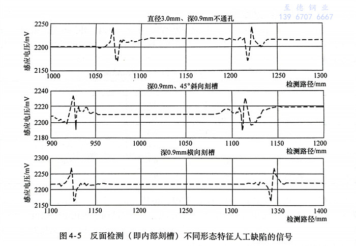 通過對(dui)相同(tong)深(shen)度(0.9mm)的(de)不通孔、45°斜向(xiang)(xiang)刻(ke)槽以及橫向(xiang)(xiang)刻(ke)槽等各種人工缺陷進(jin)行(xing)漏磁檢測試驗可以發(fa)現,缺陷的(de)形(xing)(xing)狀、位置和走向(xiang)(xiang)等形(xing)(xing)位特(te)征均對(dui)缺陷檢測信(xin)號產生了較大的(de)影響,具體體現在信(xin)號幅值(zhi)以及極值(zhi)間隔寬度上。