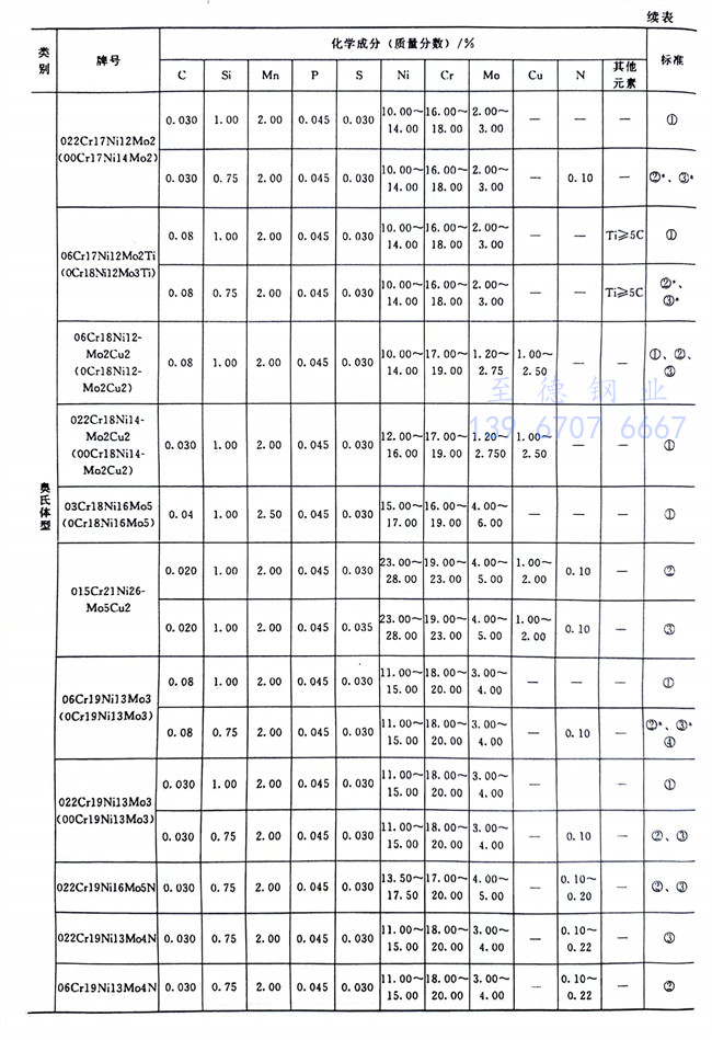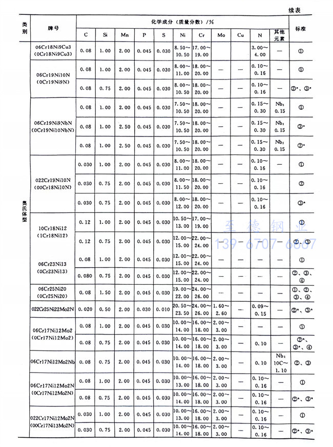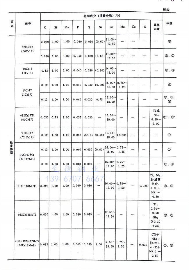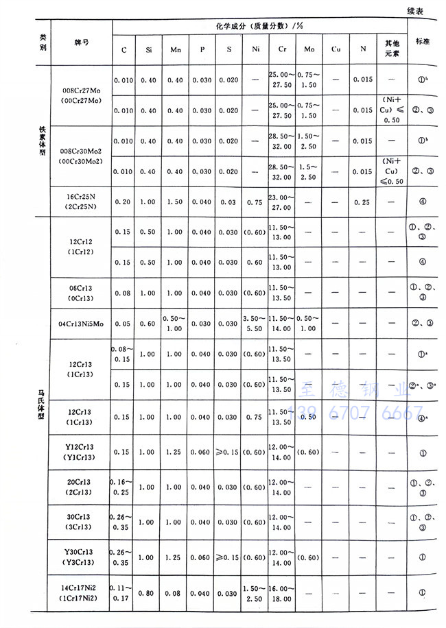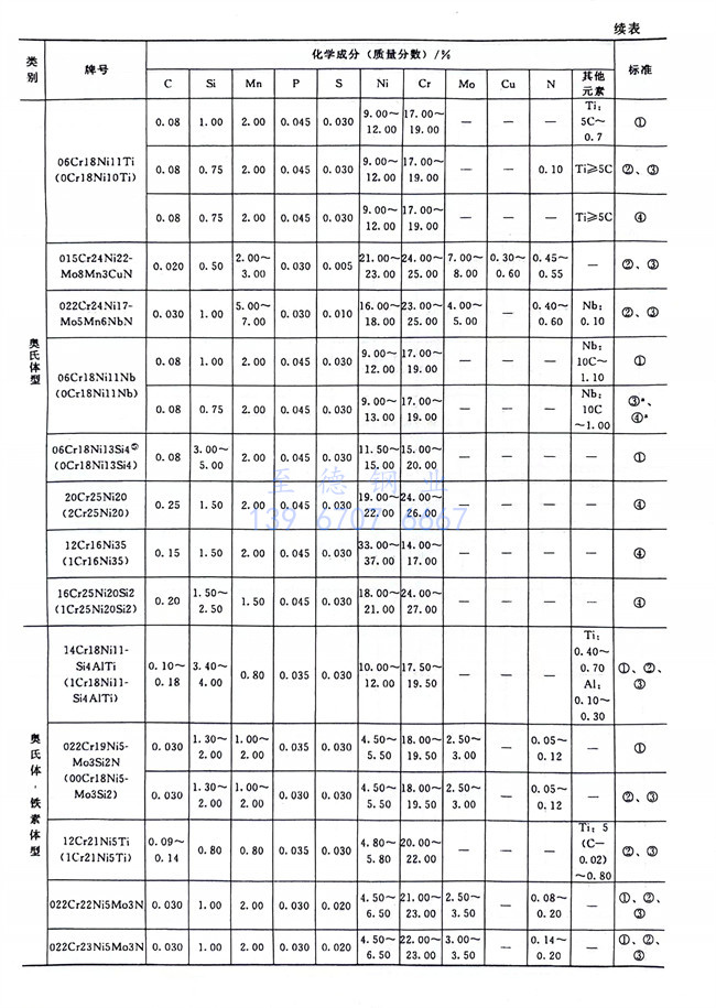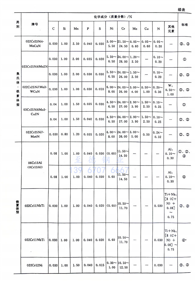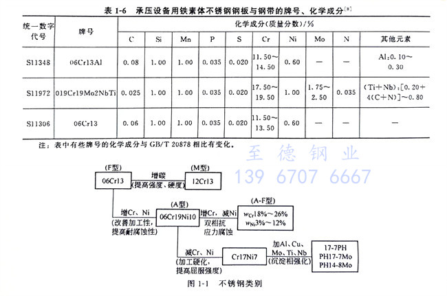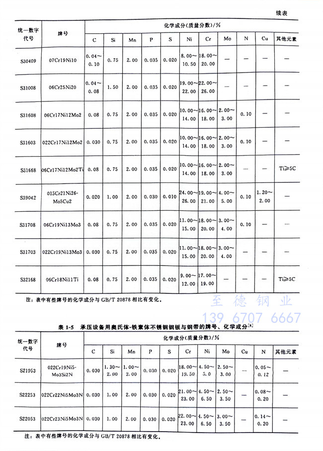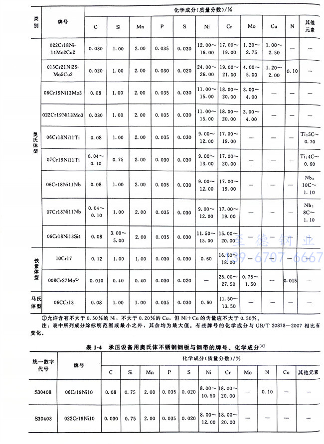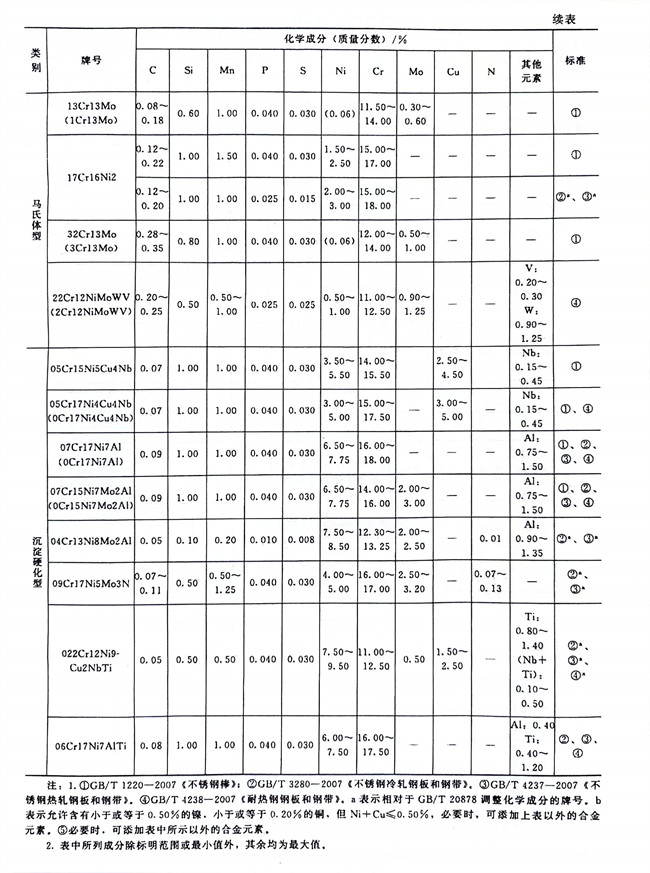 目前各國不銹(xiu)鋼牌號(hao)已超過百種(GB/T 20878-2007《不銹鋼和耐熱鋼牌號及化學成分》包含了143個牌號),不銹鋼(gang)分類方法很多,按照GB/T 13304.2-2008《鋼分類 第2部分:按主要質量等級和主要性能或使用特性的分類》以及國際上通用的分類方法(按鋼的金相組織劃分),不銹鋼分為5類,即奧氏體型不銹鋼、奧氏體-鐵素體型不銹鋼(雙(shuang)相不銹鋼)、鐵素體型不銹鋼、馬氏體型不銹鋼(gang)和沉(chen)淀硬(ying)化(hua)型不(bu)銹鋼。我國國家標準規定的不銹鋼和耐熱鋼的牌號、化學成分、組織形態見表1-1~表1-6。