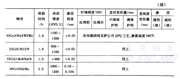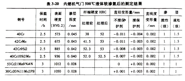 該工(gong)藝(yi)與QPQ工(gong)藝(yi)、商(shang)業鹽(yan)J-2、TF-1工(gong)藝(yi)相同。氣(qi)門經低溫無(wu)毒(du)鹽(yan)浴共滲(500℃×3h)和氧(yang)(yang)化復合處理(在160℃的氧(yang)(yang)化劑(ji)中(zhong)保溫20min)后(hou),其耐蝕性和外觀質量優異(yi),硬度均在50HRC以上,變(bian)形小。內燃機氣(qi)門500℃液體(ti)軟滲氮后(hou)的測定結果見表3-20。