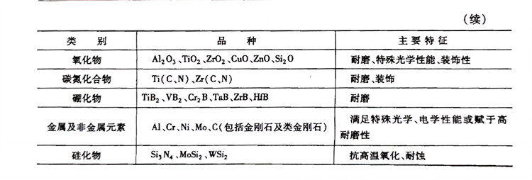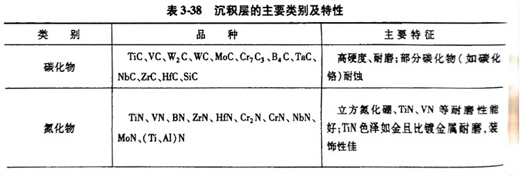 氣相(xiang)沉(chen)(chen)積按形成(cheng)的(de)(de)基(ji)本原理(li),分(fen)為化學氣相(xiang)沉(chen)(chen)積(CVD)和物(wu)理(li)氣相(xiang)沉(chen)(chen)積(PVD)。氣相(xiang)沉(chen)(chen)積是在(zai)工件(jian)(jian)表(biao)(biao)面覆(fu)蓋(gai)一層(ceng)厚度為0.5~10μm的(de)(de)過渡族元(yuan)素(su)(Ti、V、Cr、W、Nb等)與C、N、O、B等形成(cheng)的(de)(de)化合物(wu),或單一的(de)(de)金(jin)屬及非金(jin)屬涂層(ceng),使零件(jian)(jian)表(biao)(biao)層(ceng)改變化學成(cheng)分(fen),并在(zai)其表(biao)(biao)面形成(cheng)功(gong)能性(xing)(例(li)如超(chao)硬耐磨(mo)層(ceng))或裝飾性(xing)的(de)(de)化合物(wu)涂層(ceng)的(de)(de)新技術(shu),現已廣泛應用于各(ge)類(lei)零件(jian)(jian)的(de)(de)硬化處理(li)。沉(chen)(chen)積層(ceng)的(de)(de)主(zhu)要類(lei)別(bie)及特性(xing)見表(biao)(biao)3-38。