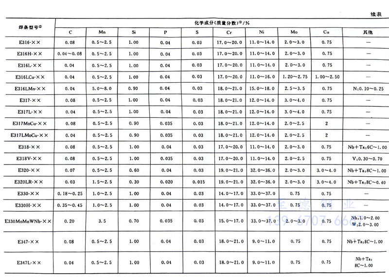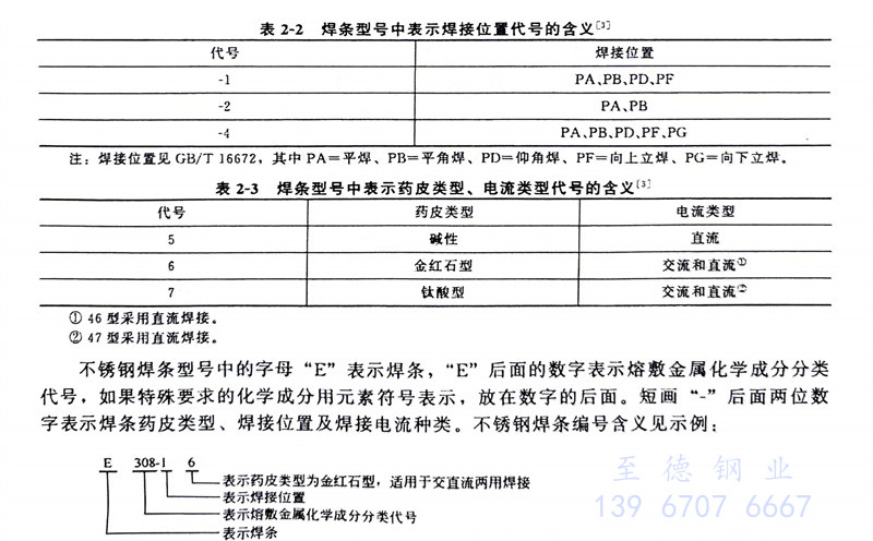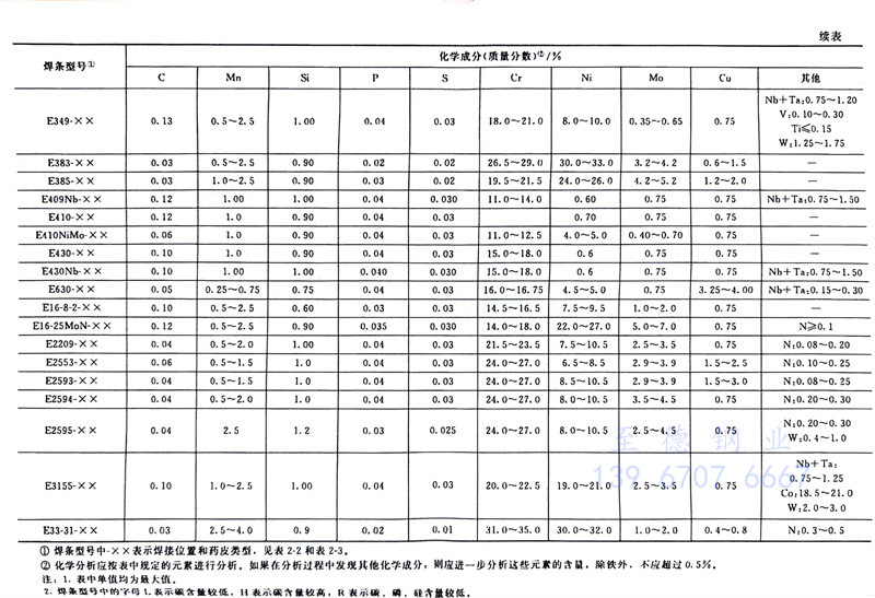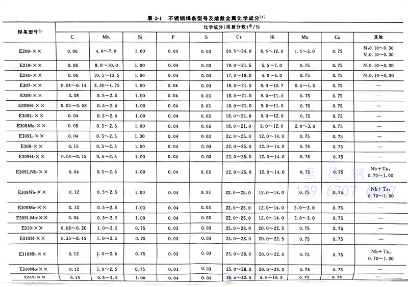 焊條型號是國家標準中對焊條規定的編號,GB/T 983-2012《不銹鋼焊條》根據焊條熔敷金屬的化學成分、焊接位置和藥皮類型、焊接電流種類規定了不(bu)銹(xiu)鋼焊(han)條型號的編排方法(與美國焊接學會標準AWS A5.4M:2006《耐蝕鉻鋼及鉻鎳鋼焊條》焊條型號的編號方法類似)。不銹鋼焊條型號及熔敷金屬化學成分見表2-1,焊條型號中的焊接位置、藥皮類型和焊接電流種類的編號方法見表2-2、表2-3。不銹鋼焊條的技術要求、性能指標、檢驗方法應符合GB/T 983-2012《不銹鋼焊條》標準的規定。用于承壓特種設備的不銹鋼焊條還應符合NB/T 47018.2-2011(JB/T 4747)《承壓設備用焊接材料訂貨技術條件 第2部分:鋼焊條》的規定。