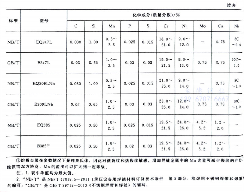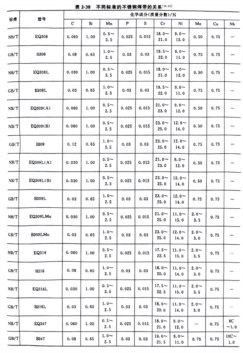 NB/T 47018.5-2011標(biao)準對S、P含量(liang)的(de)限制嚴(yan)于GB/T 29713-2013標(biao)準。NB/T 47018.5-2011標(biao)準焊(han)(han)(han)帶(dai)(dai)Mo含量(liang)上限普(pu)遍低于GB/T 29713-2013標(biao)準要求。NB/T 47018.5-2011標(biao)準規定的(de)焊(han)(han)(han)帶(dai)(dai)與GB/T 29713-2013標(biao)準規定的(de)焊(han)(han)(han)帶(dai)(dai)之間(jian)的(de)關系見表2-38。通過表2-38的(de)數據可得知兩標(biao)準的(de)焊(han)(han)(han)帶(dai)(dai)化學成分比較接近(jin)(鄰近(jin)的(de)焊(han)(han)(han)帶(dai)(dai)牌號(hao)),但沒有完全符合的(de)焊(han)(han)(han)帶(dai)(dai)。
