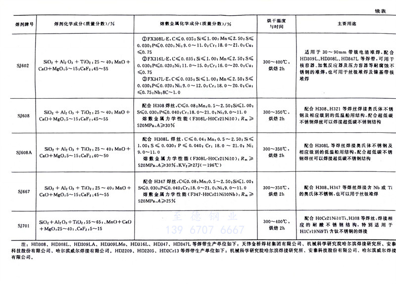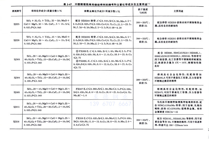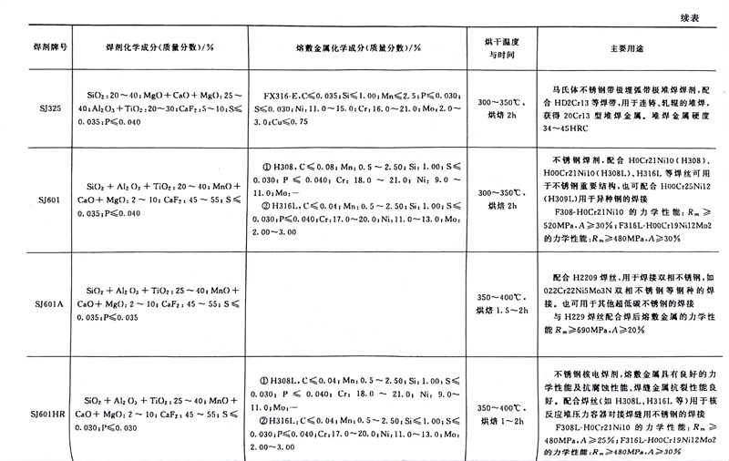 不銹鋼埋弧焊(han)用熔(rong)煉焊(han)劑的牌號(hao)和主要(yao)化(hua)學成分(fen)及主要(yao)用途見表2-45。