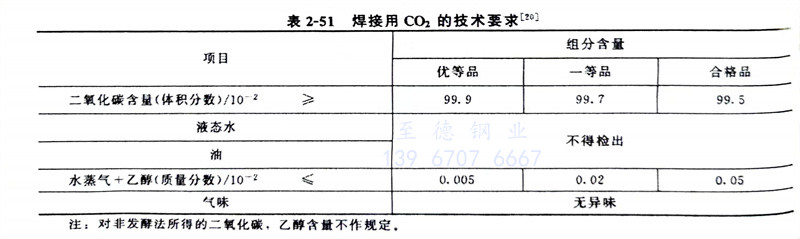 ④. 當瓶中氣壓降低到0.2MPa以下時,不得再使用。焊接用CO2的技術要求見表2-51。
