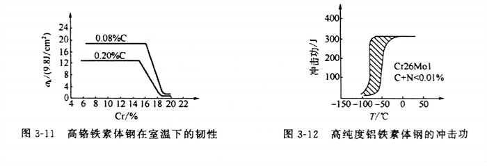高(gao)(gao)純(chun)度的(de)(de)高(gao)(gao)鉻鐵素體(ti)鋼有優秀(xiu)的(de)(de)耐應力(li)腐(fu)蝕開裂性能(neng),而(er)且(qie)純(chun)度提(ti)高(gao)(gao)后(hou)缺口(kou)敏(min)感(gan)性并不很大(da),室溫及(ji)低(di)溫下(xia)的(de)(de)韌性顯著(zhu)提(ti)高(gao)(gao),如圖(tu)3-12所示。因(yin)而(er)焊(han)(han)接時(shi)的(de)(de)裂紋傾(qing)向可顯著(zhu)降低(di)。可見,盡量限制鋼和焊(han)(han)縫中(zhong)的(de)(de)碳、氮等(deng)雜質(zhi)含量,可以顯著(zhu)改善可焊(han)(han)性。