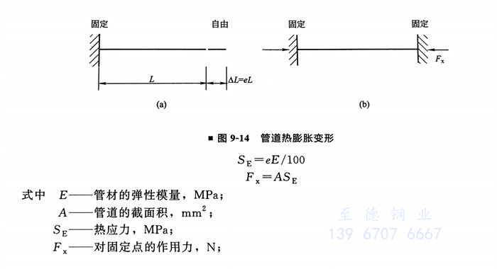 圖9-14(a)所示為一端固(gu)定(ding)一端自由(you)的管道,熱(re)(re)(re)脹時不受(shou)阻(zu),所以(yi)沒有(you)熱(re)(re)(re)應力。圖9-14(b)為兩端固(gu)定(ding)的管道,熱(re)(re)(re)脹受(shou)阻(zu)而(er)產生熱(re)(re)(re)應力SE和(he)對固(gu)定(ding)點(dian)的作用力Fx。