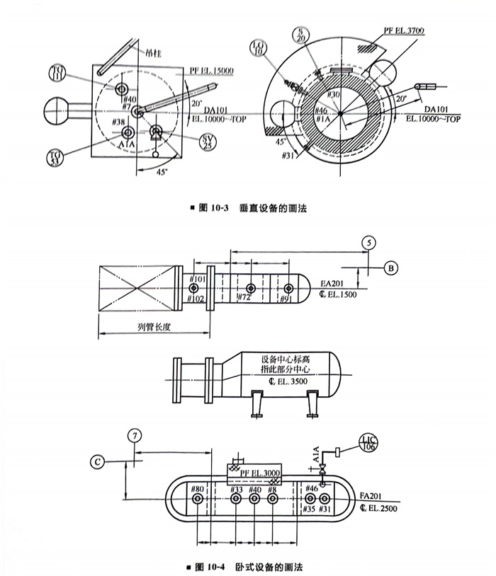 ②. 基礎外(wai)形(xing)、設(she)備外(wai)形(xing)、框架、梯子(zi)、平臺和(he)管口均要在配管圖(tu)中表示,對(dui)于泵(beng)等簡單的轉動(dong)設(she)備可不必表示其(qi)外(wai)形(xing)。