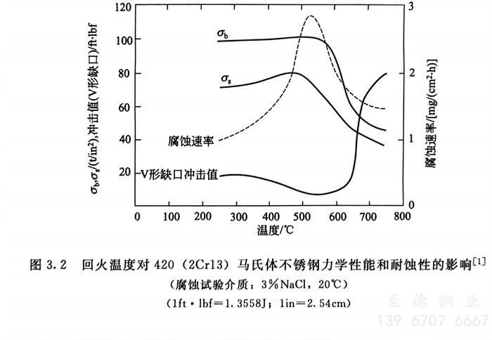 馬氏體鉻不銹鋼主要指1Cr13、2Cr13、3Cr13、4Cr13等傳統馬氏體不銹鋼(gang),它們的鉻含量≥11.5%,最高18%,使此類鋼具有不銹性和在弱介質中的鋼,它們的含鉻耐蝕性;鋼中含碳量隨鋼中含鉻量的不同,一般在0.10%~1.0%范圍內,以保證高溫下為奧氏體,淬火后室溫下為馬氏體,通過層片狀高碳馬氏體的形成和碳化物的析出,使此類鋼具有高強度和高硬度,淬火后再經回火,消除淬火應力并獲得均勻穩定的組織,使此類鋼具有一定的塑、韌性和良好的耐蝕性等綜合性能,見圖3.2。由于馬氏體鉻不銹鋼的不銹耐蝕性在所有不銹鋼類中處于劣勢(見表3.1),而且塑、韌性差,焊接性不良或根本不能焊接,從而限制了它們的廣泛應用。根據世界范圍內的統計,此類鋼的產量占不銹鋼總產量的1%左右。