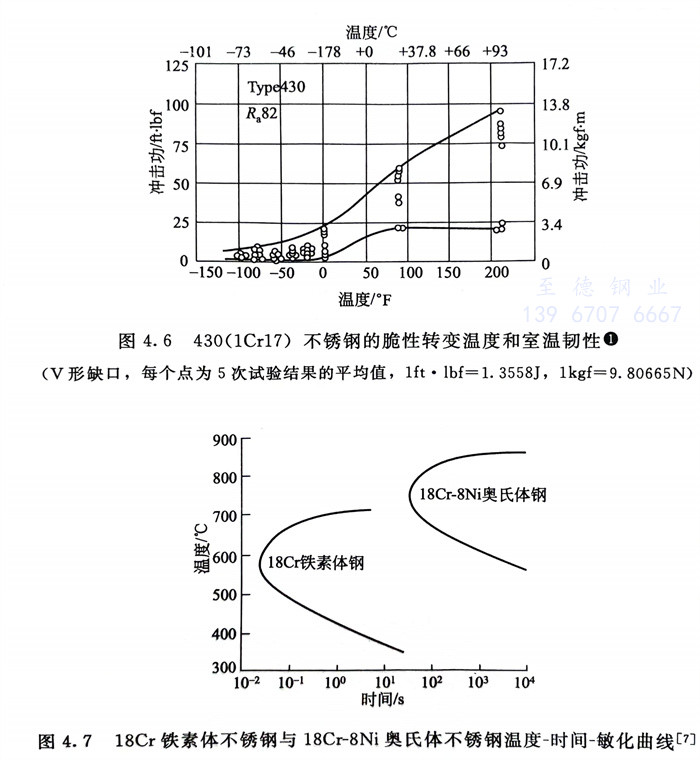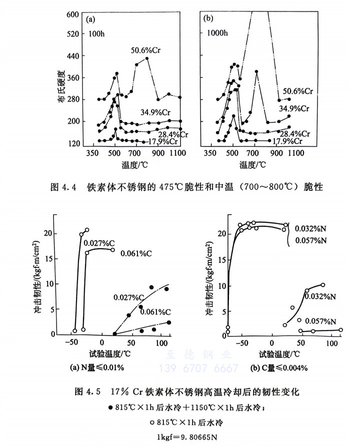 ①. 有三個(ge)脆性區,即475℃脆性、中溫脆性和高溫脆性,見圖4.4和圖4.5,此時(shi)鐵(tie)素體不銹鋼的硬度顯著增(zeng)加,塑(su)、韌性急劇下降。