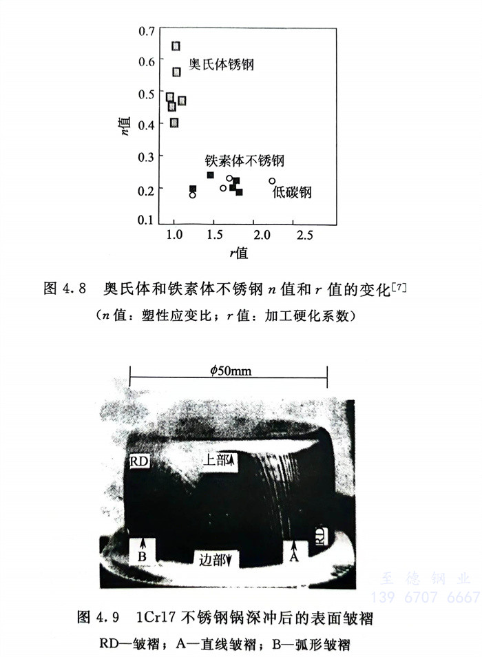 ④. 冷成(cheng)(cheng)(cheng)型(xing)性需進一(yi)(yi)步改(gai)善。雖然低、中鉻傳(chuan)統鐵(tie)素體(ti)不(bu)銹(xiu)鋼(gang)已具(ju)有(you)良(liang)(liang)好的冷成(cheng)(cheng)(cheng)型(xing)性,包括(kuo)優(you)良(liang)(liang)的深(shen)沖性,但(dan)是(shi),與(yu)18-8鉻鎳奧(ao)氏體(ti)不(bu)銹(xiu)鋼(gang)相比還有(you)一(yi)(yi)些差(cha)距,n值(zhi)較低,但(dan)與(yu)低碳鋼(gang)相近,已無太大(da)(da)提(ti)高余(yu)地,而r值(zhi)與(yu)低碳鋼(gang)相比,尚有(you)很(hen)大(da)(da)潛力,有(you)待進一(yi)(yi)步提(ti)高(圖4.8),同時,深(shen)沖件表(biao)面易出(chu)現皺褶(zhe),鋼(gang)的抗皺性尚需進一(yi)(yi)步改(gai)善,圖4.9系1Cr17(430)不(bu)銹(xiu)鋼(gang)鍋深(shen)沖后的表(biao)面皺褶(zhe)。由于鐵(tie)素體(ti)不(bu)銹(xiu)鋼(gang)冷加工硬(ying)化傾向小,伸長率低,Er(埃里克森杯突值(zhi))值(zhi)小,一(yi)(yi)般(ban)不(bu)適于單純脹(zhang)(zhang)形(xing)成(cheng)(cheng)(cheng)型(xing),但(dan)能用(yong)于深(shen)沖與(yu)脹(zhang)(zhang)形(xing)(鼓凸)復合型(xing)冷成(cheng)(cheng)(cheng)型(xing)。
