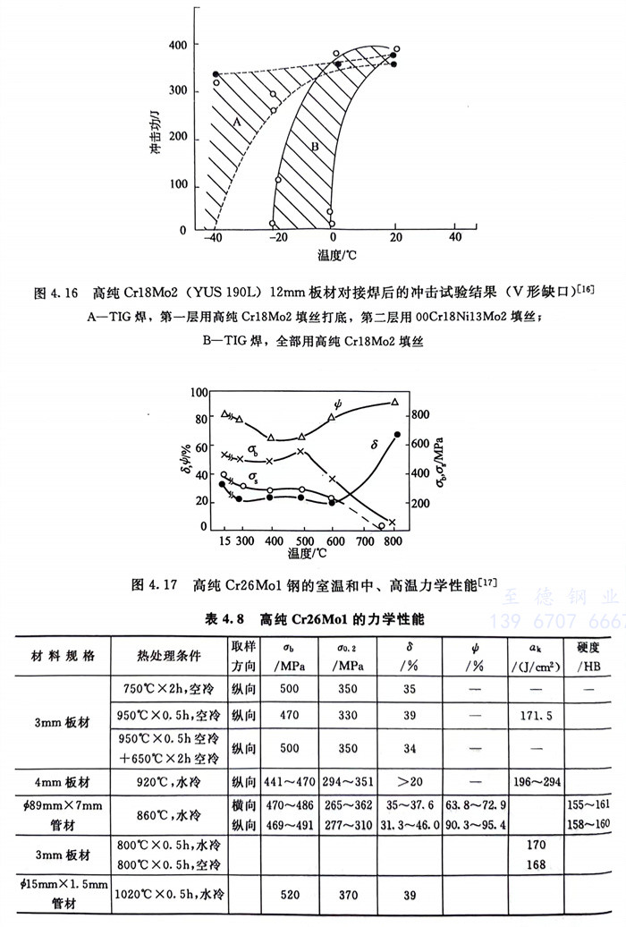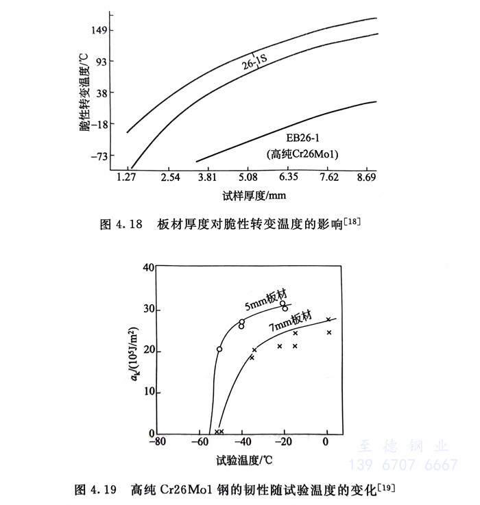 力學(xue)性能見圖4.17和(he)表4.8。脆性轉變溫度見圖4.18和(he)圖4.19。一(yi)般認為高(gao)純Cr26Mo1截(jie)面尺寸(cun)適用(yong)于≤6mm或≤7mm板、帶材(cai)、管(guan)材(cai)。