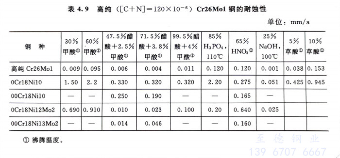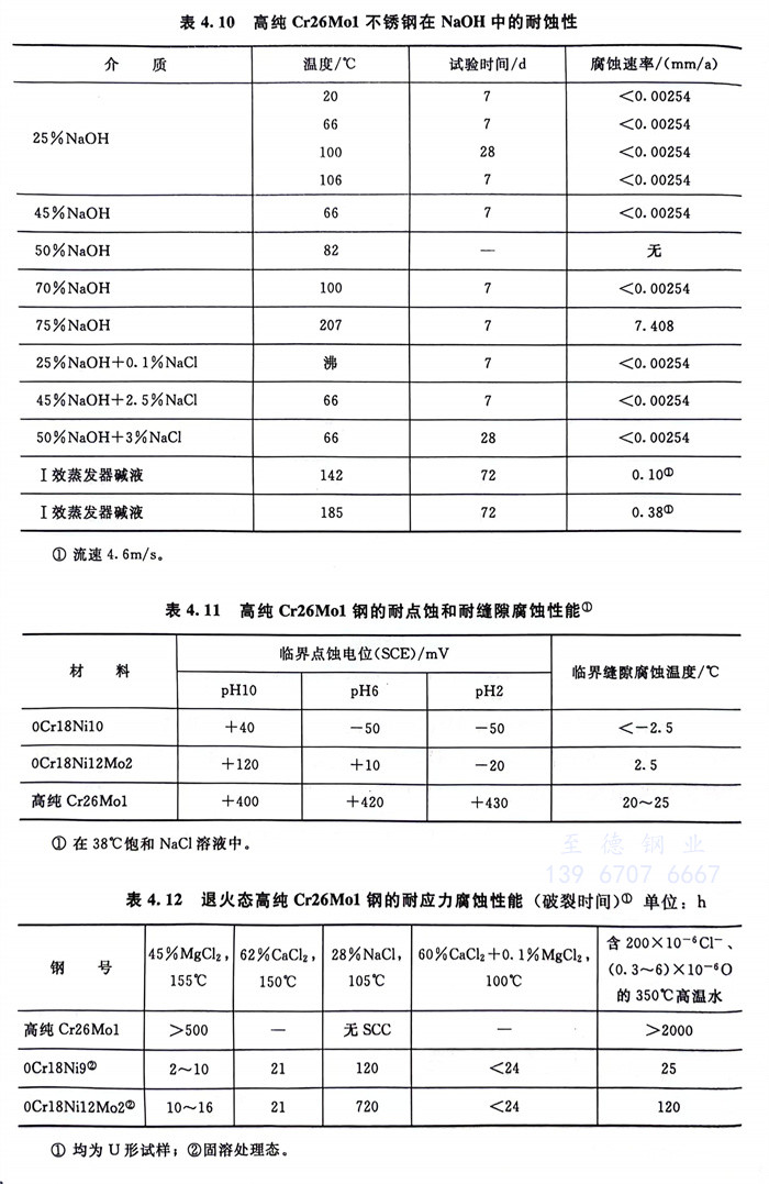 高純Cr26Mo1耐(nai)蝕(shi)(shi)性優良,即使在65%沸騰(teng)HNO3和(he)NaOH中(zhong)亦(yi)然(見(jian)表4.9和(he)表4.10);在耐(nai)點(dian)蝕(shi)(shi)、耐(nai)縫(feng)隙腐蝕(shi)(shi)、耐(nai)應力腐蝕(shi)(shi)等局部腐蝕(shi)(shi)中(zhong)均既優于0Cr18Ni10,也優于0Cr18Ni12Mo2。一些結果見(jian)表4.11和(he)表4.12。