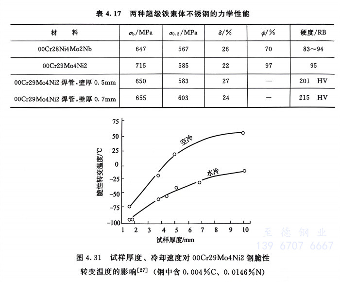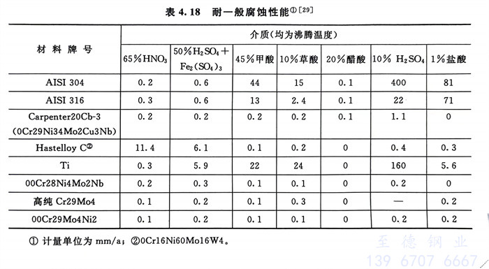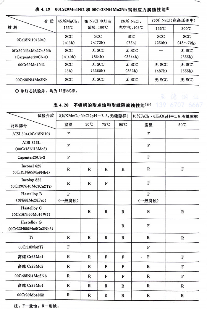 00Cr29Mo4Ni2和00Cr28Ni4Mo2Nb兩種超級鐵素體不銹鋼(gang)耐全面腐蝕、耐點蝕和縫隙腐蝕以及耐應力腐蝕的性能見表4.18~表4.20和圖4.33。