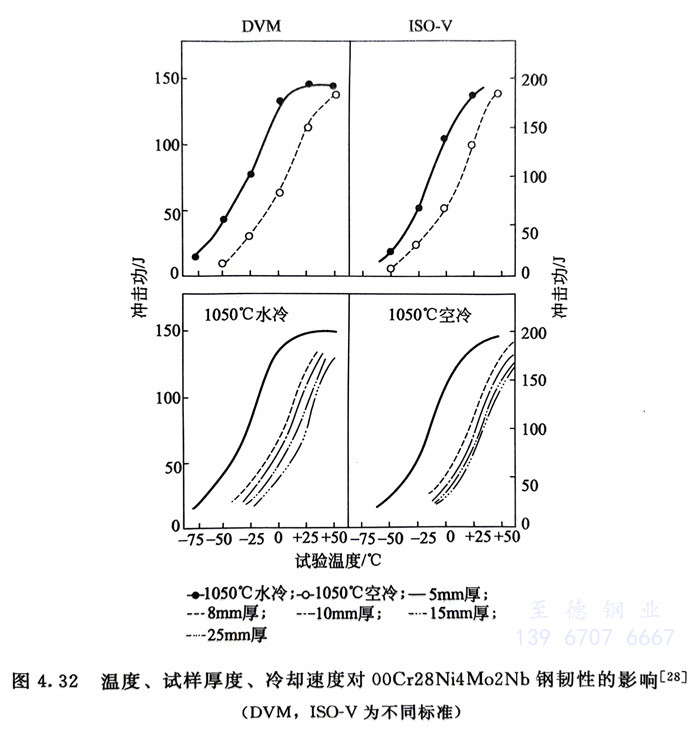 一些試驗結果見表4.17、圖4.31及圖4.32。可以看出:兩種超(chao)級鐵素(su)體不銹鋼的韌性和脆性轉變溫度均受鋼的截面和冷卻速度的影響,在適宜的截面尺寸下,兩種鋼均具有足夠的室溫韌性和較低的脆性轉變溫度。