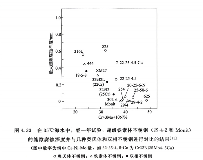 從表4.18~表4.20中的結果可看出00Cr29Mo4Ni2和00Cr28Ni4Mo2Nb具有優良的耐蝕性,在耐點蝕和縫隙腐蝕方面,00Cr29Mo4Ni2還優于00Cr28Ni4Mo2并且還超過了高鎳耐(nai)蝕合金Capenter20Cb-3(0Cr29Ni34Mo2Cu3Nb)和Inconel 625(0Cr21Ni65Mo9Nb4)。從圖4.33在實際海水中一年的試驗結果表明,超級鐵素體不銹鋼29-4-2(00Cr29Mo4Ni2),Monit(00Cr25Mo4Ni4),高純Cr30Mo2、Cr29Mo4(圖中302和29-4)均優于所有高牌號的奧氏體不銹鋼,且與超級奧氏體不銹鋼,如254 SMO(圖中254),00Cr20Ni25Mo6N(圖中20-25-6-N)以及高鎳耐蝕合金00Cr21Ni65Mo9Nb4(圖中625)相比,耐蝕性也相同或稍優。