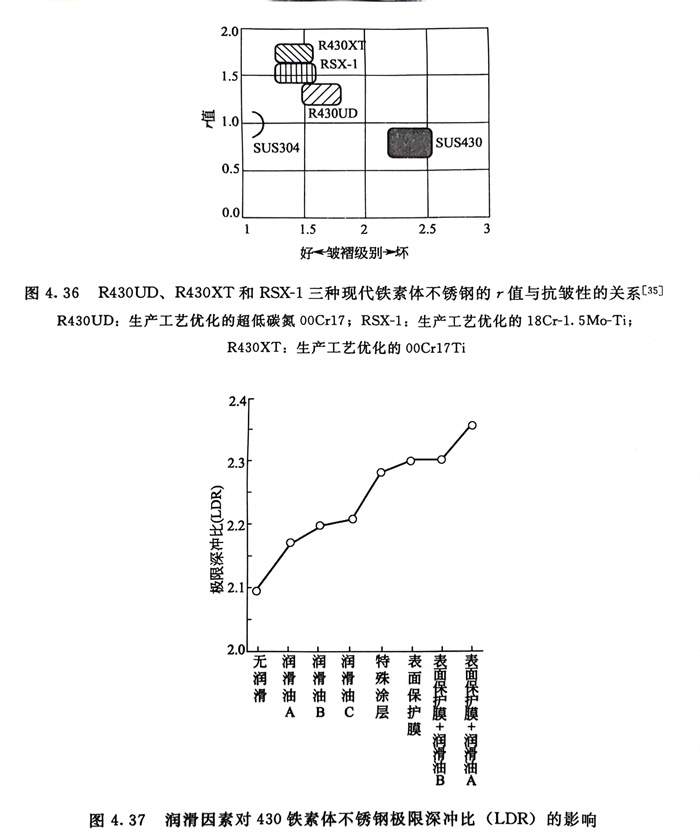表(biao)4.23列出(chu)了1Cr17、00Cr17Ti、00Cr17CuNb和(he) 1Cr18Mo1.5Ti、00Cr18Mo1.5Ti鋼(gang)的冷成(cheng)型性(xing)參數(shu)。圖(tu)4.36還給出(chu)了這幾種鋼(gang)的r值和(he)抗皺性(xing)的關系中所(suo)處(chu)的位置。研究表(biao)明,為了提高鐵(tie)素體不銹鋼(gang)的深(shen)沖性(xing),除材(cai)料本身(shen)的性(xing)能外,冷成(cheng)型時的潤滑條件也有(you)很(hen)大的影響(xiang)(圖(tu)4.37)。由于00Cr18Mo1.5Ti鋼(gang)具有(you)優異的冷成(cheng)型性(xing),國外已制(zhi)成(cheng)(深(shen)沖)具有(you)凹(ao)凸復雜形狀的汽(qi)車燃油(you)箱。