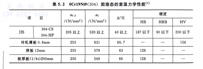 由于18-8鋼冷、熱加工性優良,它可順利地生產各種冶金產品,如板、管、絲、帶、型材(包括異型材)等,且力學性能優良(表5.2),特別是具有優異的塑、韌性。由于沒有脆性轉變溫度(圖5.4),18-8鋼也是常用的低溫不銹鋼之一。通過冷作硬化,06Cr19Ni10的強度可有明顯提高(圖5.5)。隨冷變形量增加,鋼的硬度增加,伸長率降低,這與冷加工變形量的增加,形變馬氏體的大量形成有關。