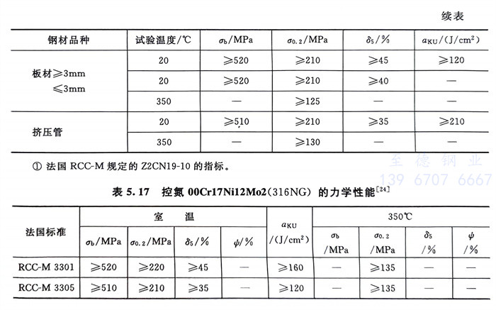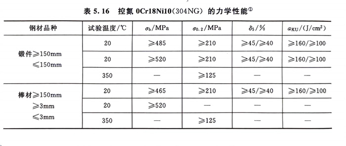 控氮0Cr18Ni10(304NG)和控氮00Cr17Ni12Mo2 (316NG)的力學(xue)性能分別列(lie)人表5.16和表5.17中。