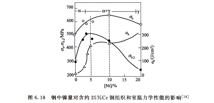 圖6.18系浙江至德鋼業有限公司試驗取得的結果。在含25%Cr雙相不銹鋼管(guan)的情況下,加入不同鎳量,調整不同的鉻當量/鎳當量以獲得不同的相比例并測定了它們的力學性能。可以看出,隨鋼中鎳量的增加,此鋼從單相鐵素體向α+γ雙相組織過渡,當含鎳量約達18%時,又基本上系單相奧氏體。在雙相區內,當含鎳量在約5%時,鋼的屈服強度達到最高值,此時的a/γ比例并不到1:1,鎳量再增加,y量加大,則屈服強度明顯下降;當含鎳量約達10%,此時γ量已超過50%,鋼的抗拉強度達到最高值,隨后稍有下降;而鋼的沖擊韌性值則隨鎳量增加、γ相量的增多而提高,達單一奧氏體組織時,此鋼具有最高的沖擊韌性值。