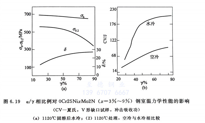 圖(tu)6.19系含(han)3%~9%Ni的(de)0Cr25NixMo2N雙相不銹鋼(gang)(gang)管,經不同固溶處理后的(de)相比(bi)例對鋼(gang)(gang)的(de)力學(xue)性(xing)能的(de)影響(xiang)。可(ke)以看出,隨γ奧氏體量(liang)增(zeng)加,屈服強度(du)明(ming)顯(xian)下降,而伸長率和沖擊(ji)功(gong)則明(ming)顯(xian)上升,此結果(guo)與圖(tu)6.18的(de)結果(guo)基(ji)本一致(zhi)。圖(tu)中冷(leng)卻(que)速度(du)(水冷(leng)、空冷(leng))不同,鋼(gang)(gang)的(de)沖擊(ji)功(gong)差別較大,這(zhe)顯(xian)示了鋼(gang)(gang)中鐵素體的(de)存在,碳、氮化物(wu)析出的(de)影響(xiang)。
