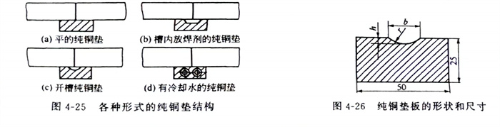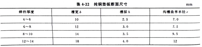 這(zhe)種(zhong)焊接方(fang)法能使焊接構件(jian)達到單面(mian)焊背面(mian)成形(xing)的(de)(de)(de)目的(de)(de)(de)。純銅墊(dian)靠焊接夾具緊(jin)貼(tie)待(dai)焊接頭下面(mian),它(ta)與焊件(jian)之間(jian)的(de)(de)(de)間(jian)隙不允許(xu)大于0.5mm,各種(zhong)形(xing)式的(de)(de)(de)純銅墊(dian)結(jie)構如圖(tu)4-25所(suo)示,純銅墊(dian)板的(de)(de)(de)形(xing)狀和尺寸見圖(tu)4-26和表4-22。在(zai)純銅墊(dian)接觸焊件(jian)的(de)(de)(de)一(yi)面(mian)開槽(cao),槽(cao)的(de)(de)(de)中心要與坡口(kou)根間(jian)隙對(dui)準,如果(guo)在(zai)槽(cao)內(nei)放焊劑[見圖(tu)4-25(b)],則檀的(de)(de)(de)寬度和深度都(dou)要相應地加寬加深。