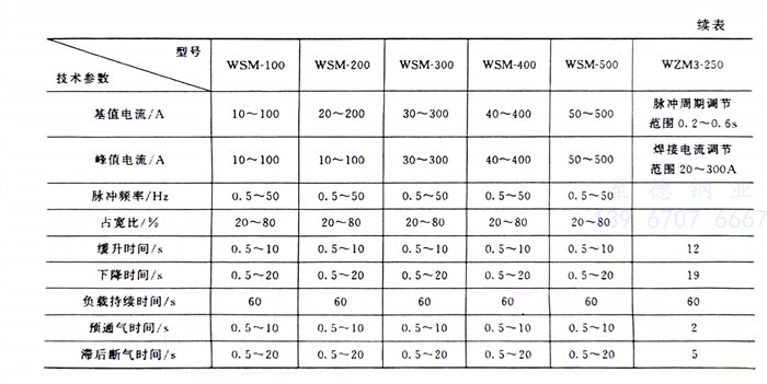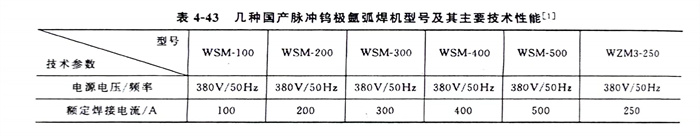 有關脈沖(chong)鎢極(ji)氬弧(hu)焊(han)機(ji)的型號很多,表4-43列出了國內(nei)幾種脈沖(chong)鎢極(ji)氬弧(hu)焊(han)機(ji)型號及其主要技術性能,可供選用。