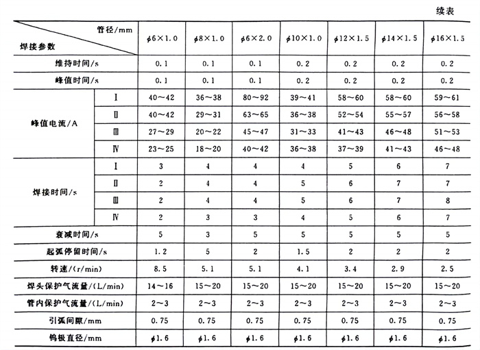 焊(han)(han)接(jie)參(can)(can)數(shu)對焊(han)(han)接(jie)質量的(de)影(ying)響(xiang)頗大,其中(zhong)峰(feng)值電流(liu)在每(mei)個焊(han)(han)接(jie)區(qu)域(導管固定(ding)不動,焊(han)(han)接(jie)分上、下、左、右(you)4個區(qu))的(de)變(bian)化值、引弧間隙、氣體流(liu)量、鎢極(ji)直徑等參(can)(can)數(shu)變(bian)化的(de)影(ying)響(xiang)較為突(tu)出。經過一系列的(de)焊(han)(han)接(jie)工藝試驗(yan)得出如表4-58所示(shi)的(de)數(shu)值。