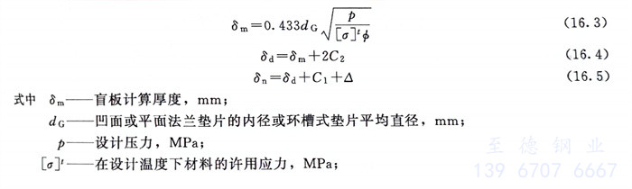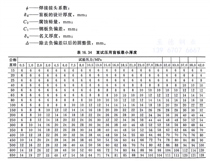 夾在兩法蘭之(zhi)間的盲板,其計算厚(hou)(hou)度(du)可按(an)式(shi)(shi)(16.3)確(que)定。用整(zheng)體鋼板制造時,式(shi)(shi)中焊(han)接接頭系數等于1.0。對于永久性盲板應按(an)式(shi)(shi)(16.5)增(zeng)加(jia)厚(hou)(hou)度(du)附加(jia)量。某試壓用盲板最小厚(hou)(hou)度(du)見(jian)表(biao)16.34。